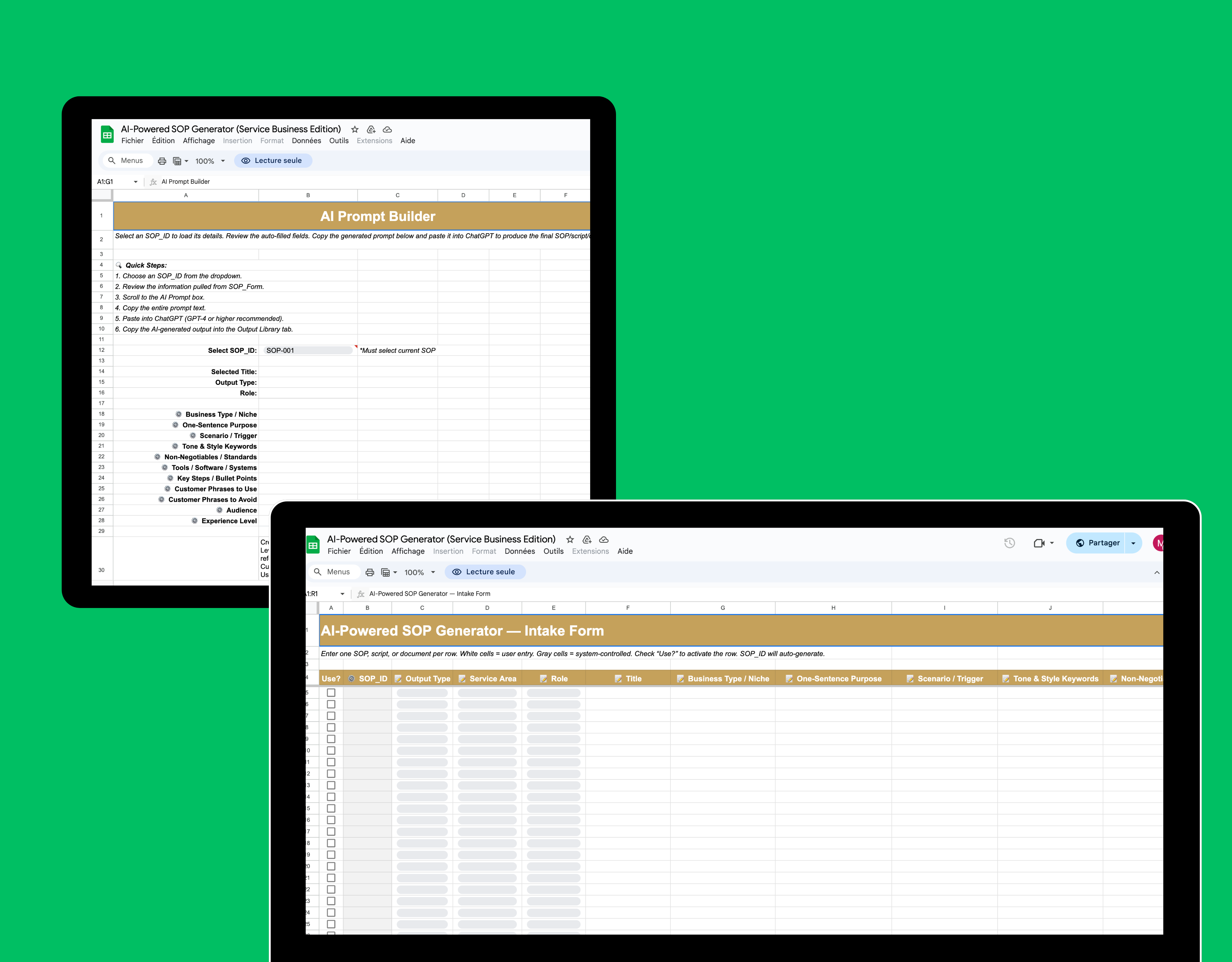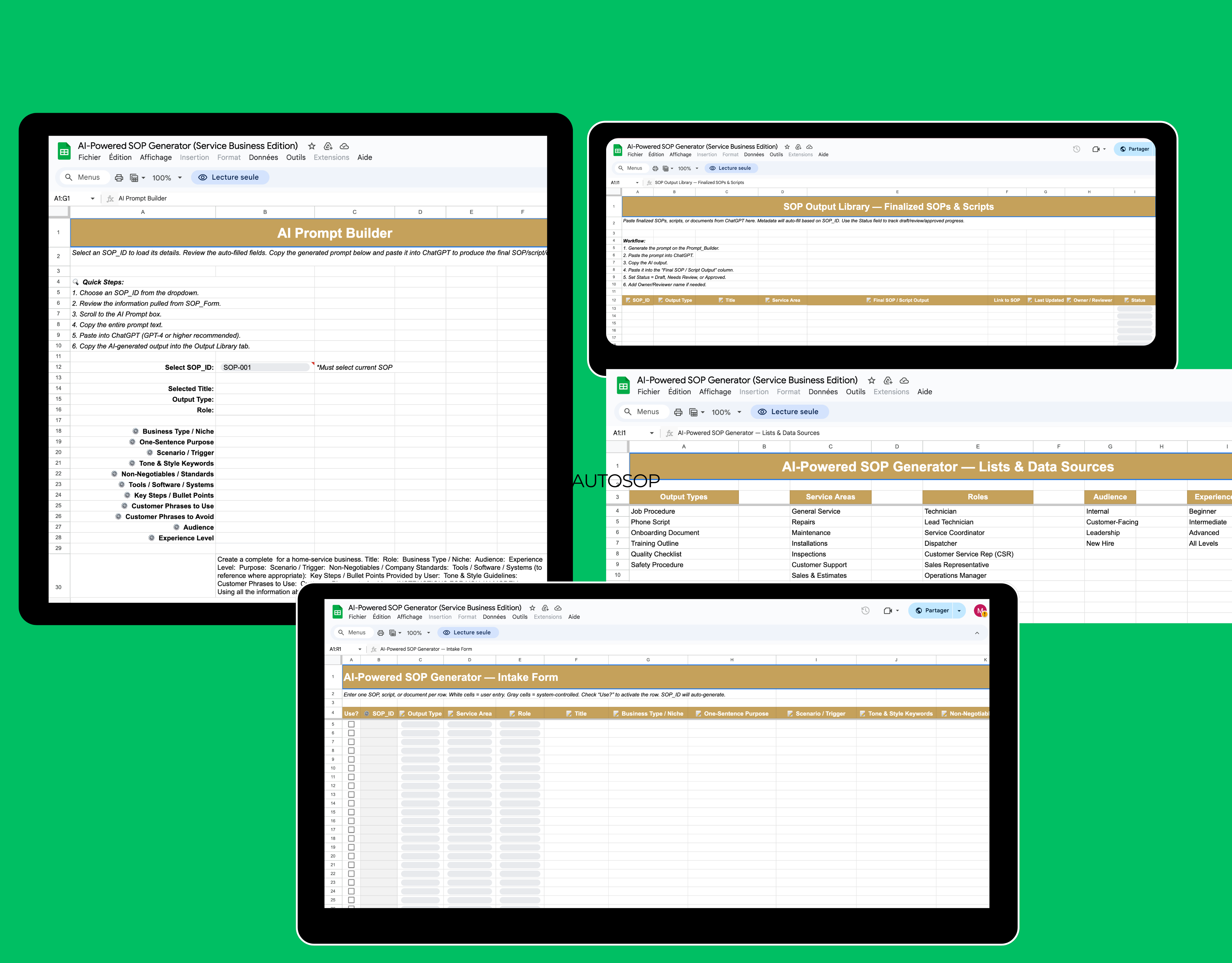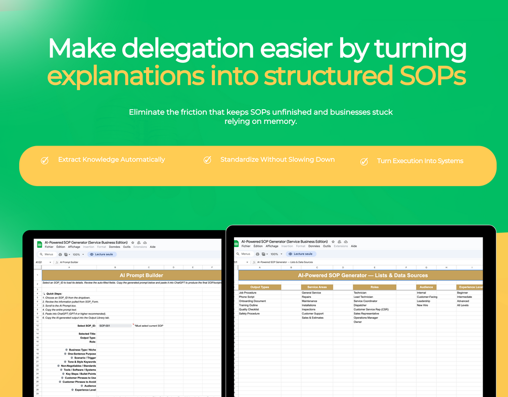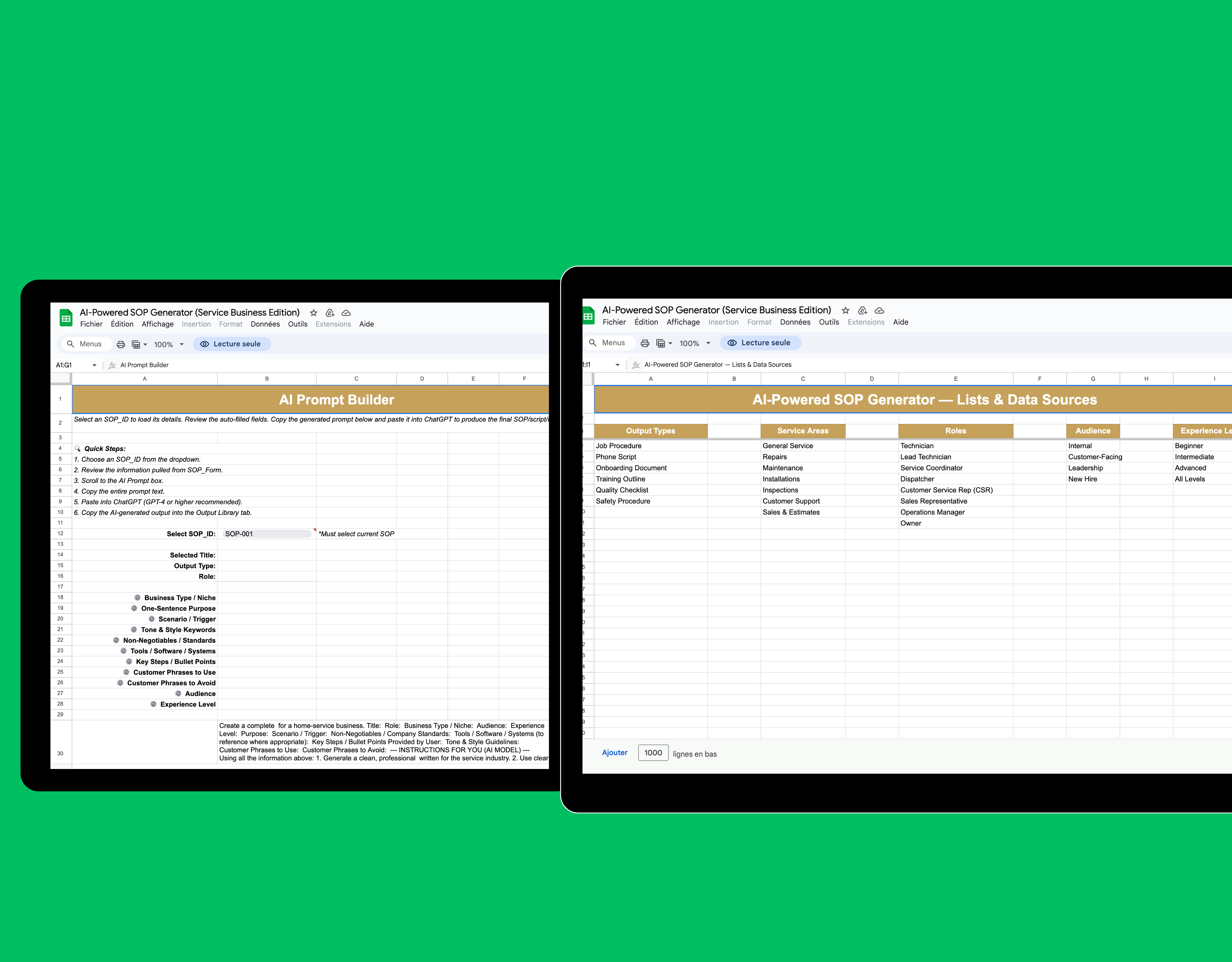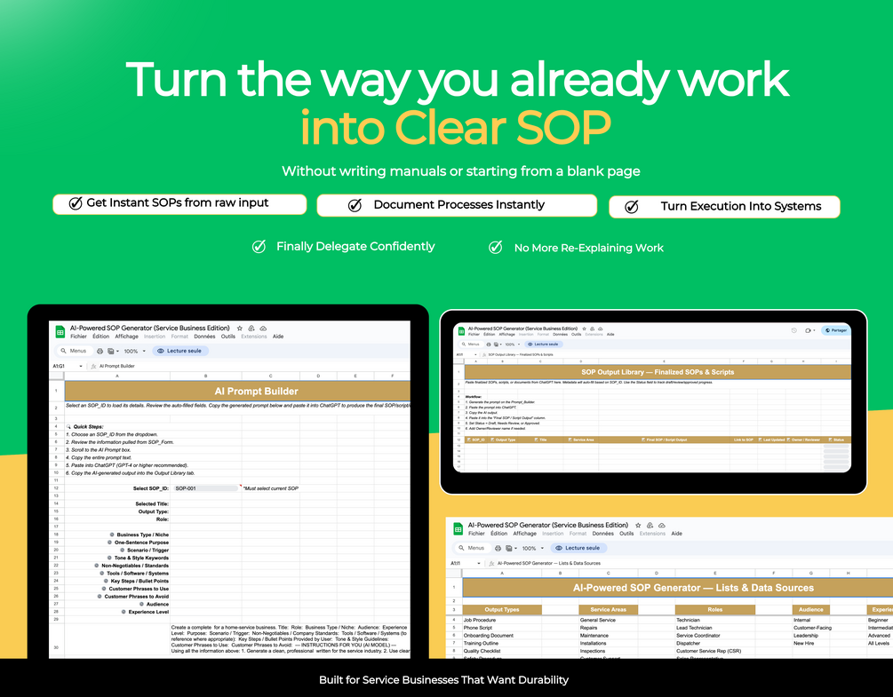 A Google Sheet that asks the right questions and outputs the exact AI prompt needed to generate an SOP. -