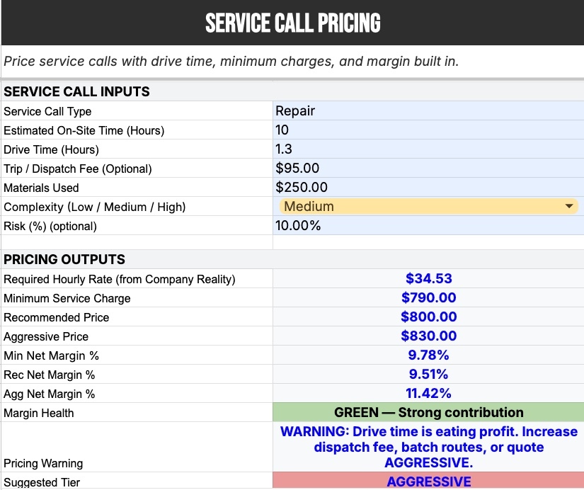 - Service Call Calculator: Stop losing money on the road. Specifically accounts for drive time and short-job inefficiencies that quietly erode profits.