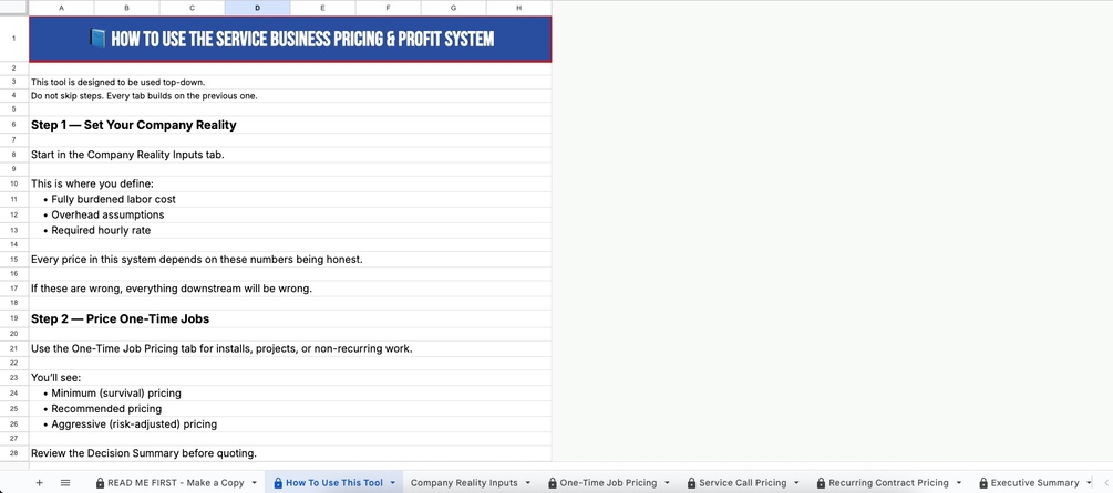 The Service Business Pricing & Profit System is a disciplined decision-making framework built in Google Sheets. It is designed specifically for Landscaping, HVAC, Plumbing, Electrical, and Pool Service operators who are tired of inconsistent margins and scope creep.