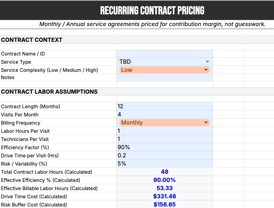 - Recurring Contract Engine: Price monthly agreements based on contribution margin and execution risk. Identify "underwater" contracts before you sign them.